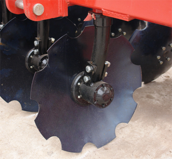 Каждый обрабатывающий диск установлен на индивидуальной стойке в 4 ряда и имеет наклон от вертикальной оси. Наклон диска способствует самоочищению диска. Диск при этом выполняет роль лемеха и отвала, что способствует лучшему обороту отрезаемого пласта, его крошению, а также снижает потребное тяговое усилие трактора-тягача. Отсутствие единой оси дисков снижает наматывание растительных остатков и забивание орудия. Каждый ряд дисков имеет возможность отдельной регулировки угла атаки и соответственно глубины обработки. Индивидуальная подвеска рабочих дисков упрощает обслуживание и ремонт.
