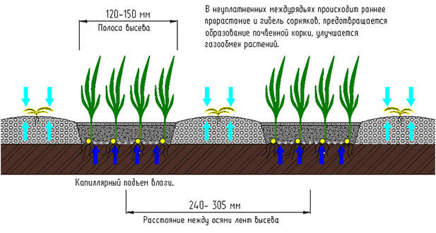 - Посев широкой полосой в 12-15 см обеспечивает в 4 раза большую площадь питания и сильно уменьшает прямой контакт семян с удобрениями